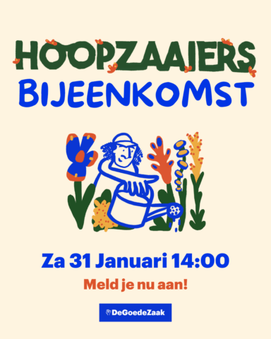 In 2026 zetten we de Hoopzaaiers met veel enthousiasme voort. Daar hebben we jullie bij nodig! Op 31 januari organiseren we daarom een Hoopzaaiersbijeenkomst. Een dag om samen terug te blikken, vooruit te kijken, verdiepende workshops te volgen én natuurlijk gezellig te borrelen. Kom jij ook?
